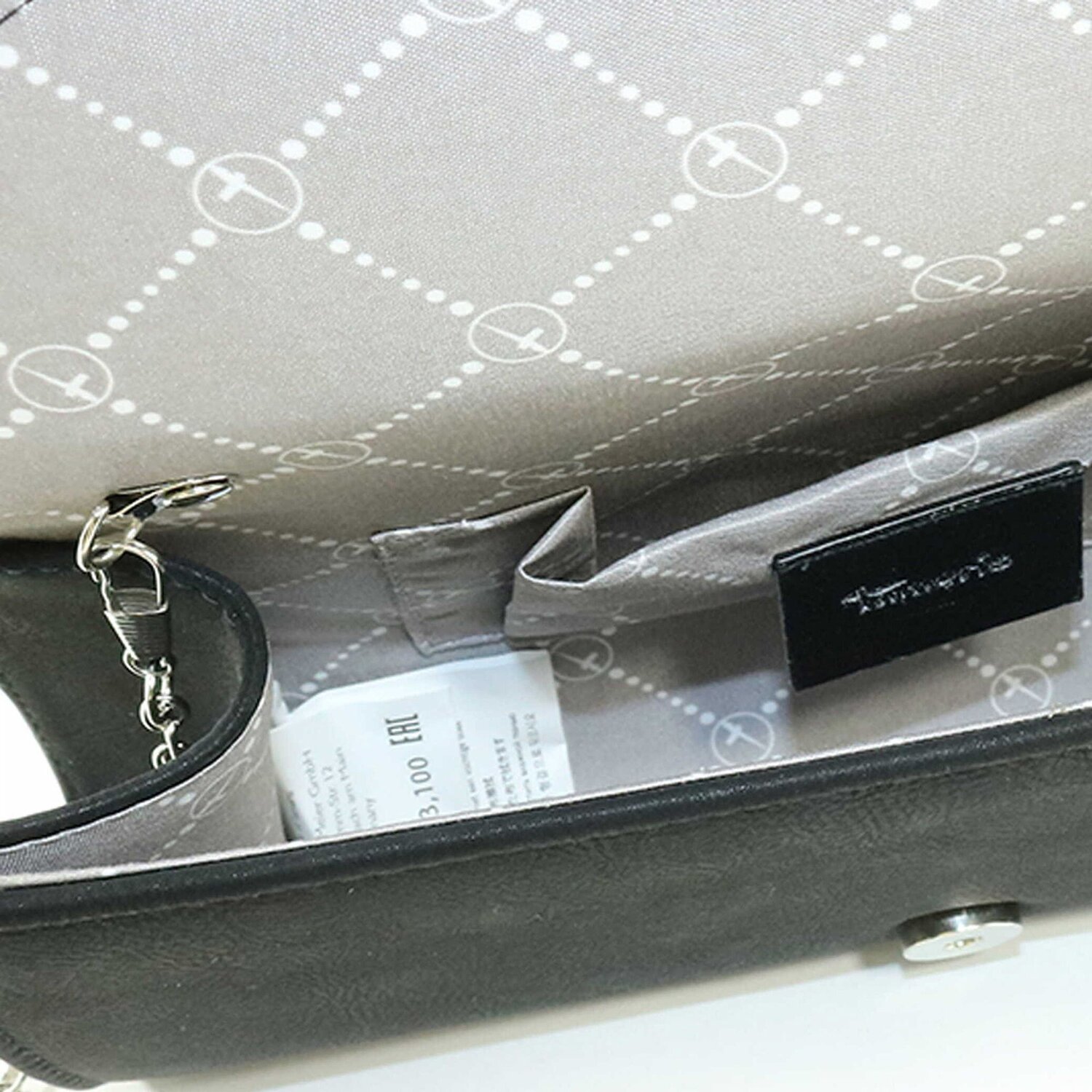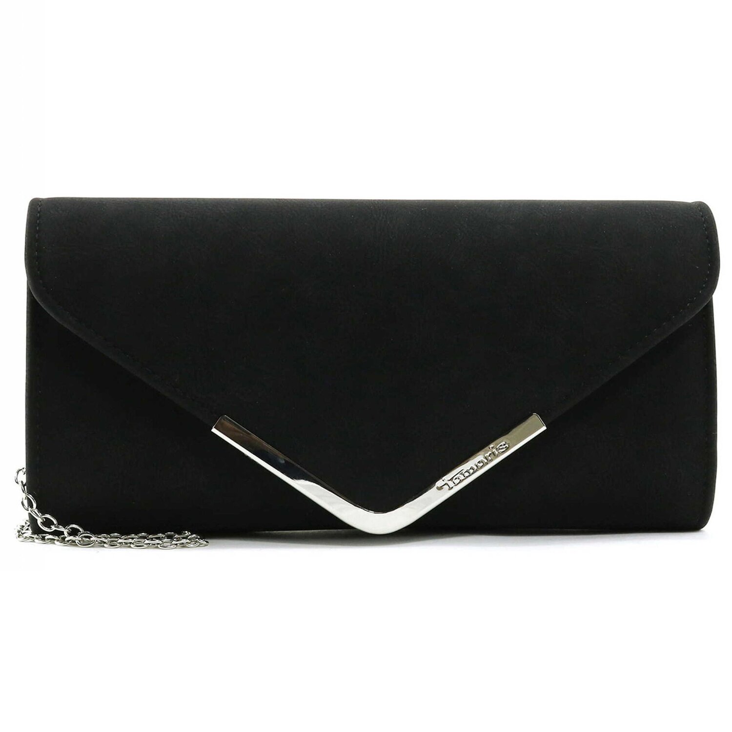 Schöne Clutch Tasche von Tamaris Die Tasche bietet genügend Stauraum für die wichtigsten Sachen und ist der ideale Begleiter für einen festlichen Abend. Der längenverstellbare Umhängeriemen ist mit Kettenelementen verziert.
