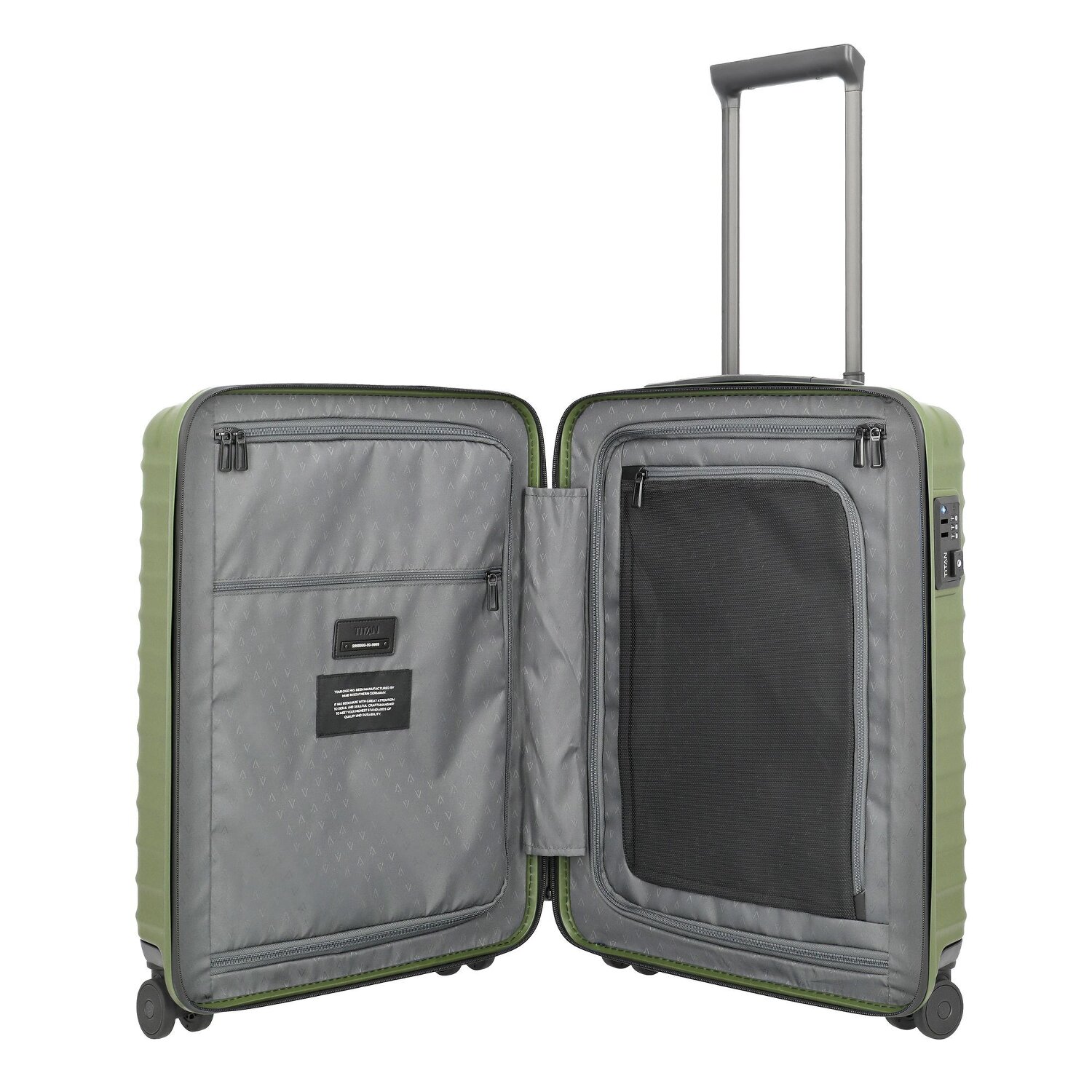 Erleben Sie Reisefreude mit dem Kabinentrolley mit 4 Rollen aus der Upgrade-Serie von Titan. Spüren Sie den Unterschied: Bereitgestellt mit einem arretierbaren Griff für absolute Kontrolle, einem Wäschefach, Kreuzpackgurt und zusätzlichen Innenfächern. Verstärkte Ecken und ein extra Reißverschlussfach maximieren die Sicherheit Ihrer Habseligkeiten ohne Kompromisse. Doch was dieses Schmuckstück wirklich auszeichnet, ist sein Tragegriff für ein müheloses Händling. Gefertigt aus strapazierfähigem Polycarbonat, meistert es jeden Reisetumult mit Leichtigkeit. Mit einem im Design integrierten TSA-Schloss bleiben Ihre Wertgegenstände stets gesichert. Lassen Sie dieses Luxus-Accessoire nicht entgehen!