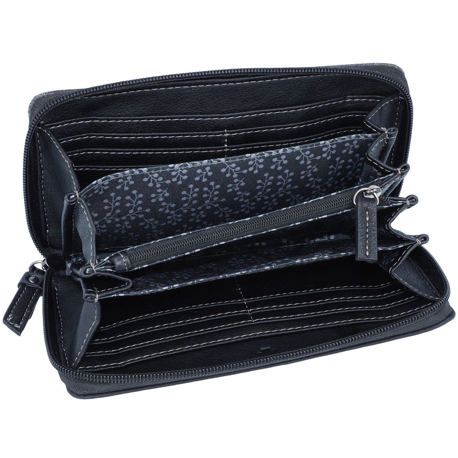 Modische Geldbörse von Tom Tailor im Querformat aus weichem Kunstleder. Im Inneren finden allerlei Karten, Belege, Münzen und Scheine platz.