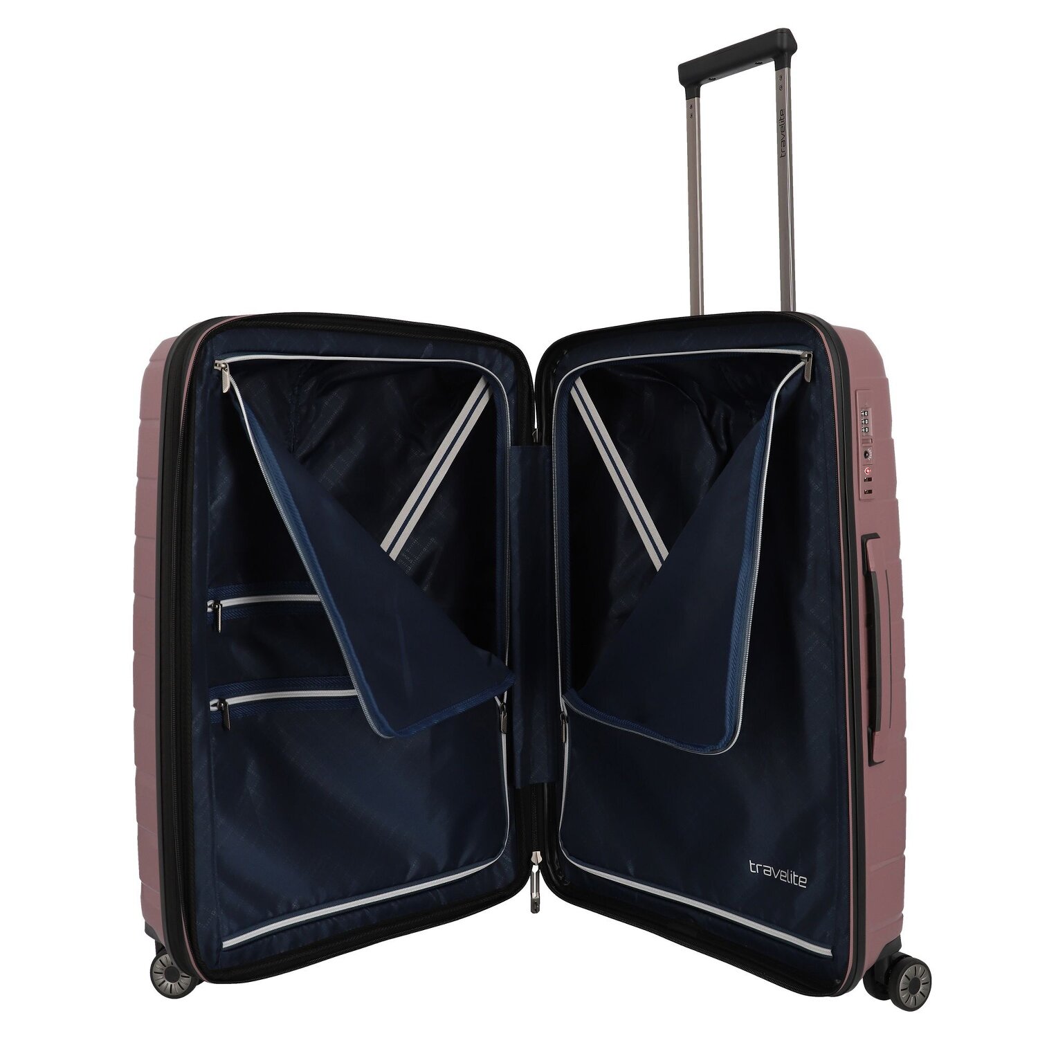 - Ausstattung: Reißverschlussfach, Kreuzpackgurt, Dehnfalte, arretierbarer Griff