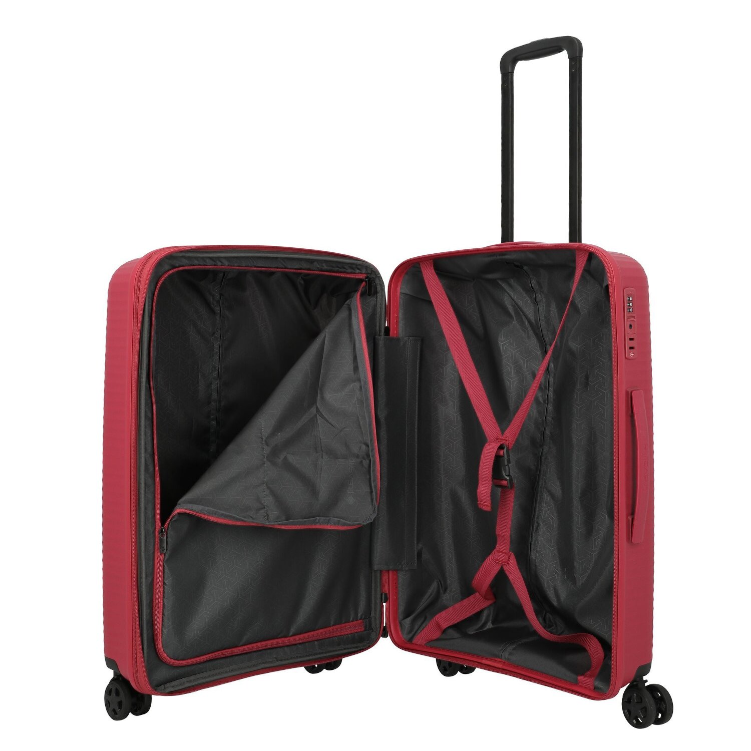 - Ausstattung: Wäschefach, Reißverschlussfach, Kreuzpackgurt, Dehnfalte, arretierbarer Griff