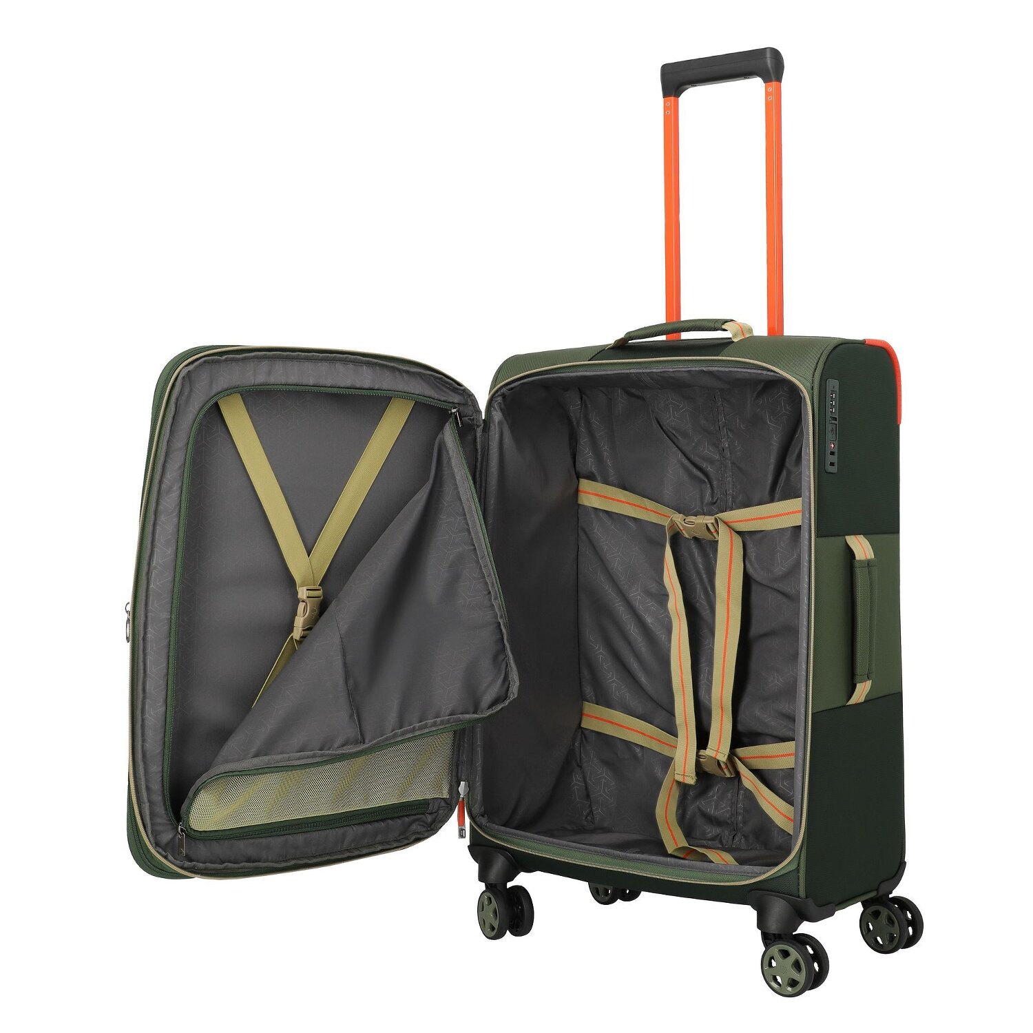 - Ausstattung: Tasche(n) außen, Reißverschlussfach, Netzfach, Kreuzpackgurt, Dehnfalte, arretierbarer Griff