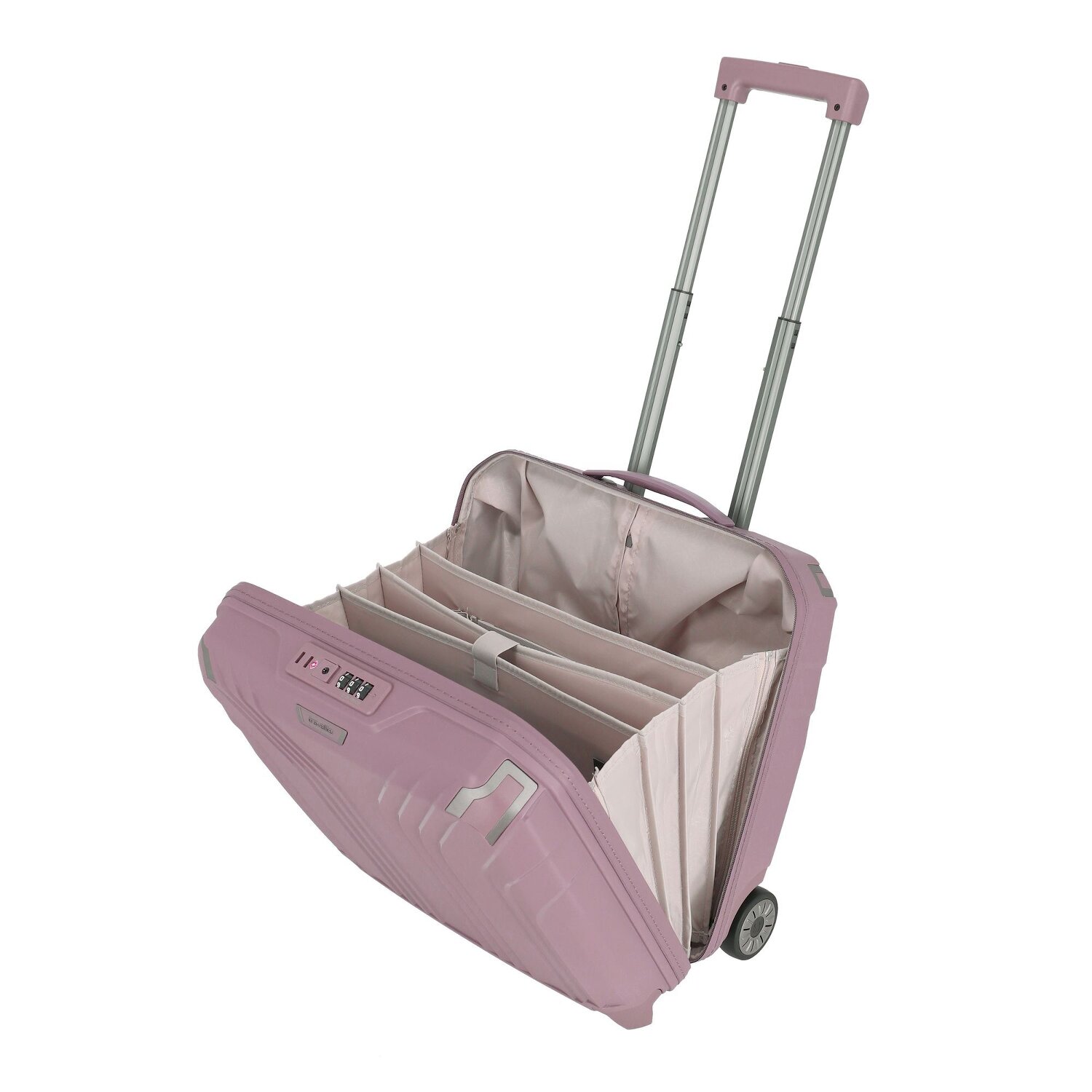 - Ausstattung: verstärkte Ecken, Tasche(n) innen, Reißverschlussfach, auf Trolley steckbar, arretierbarer Griff