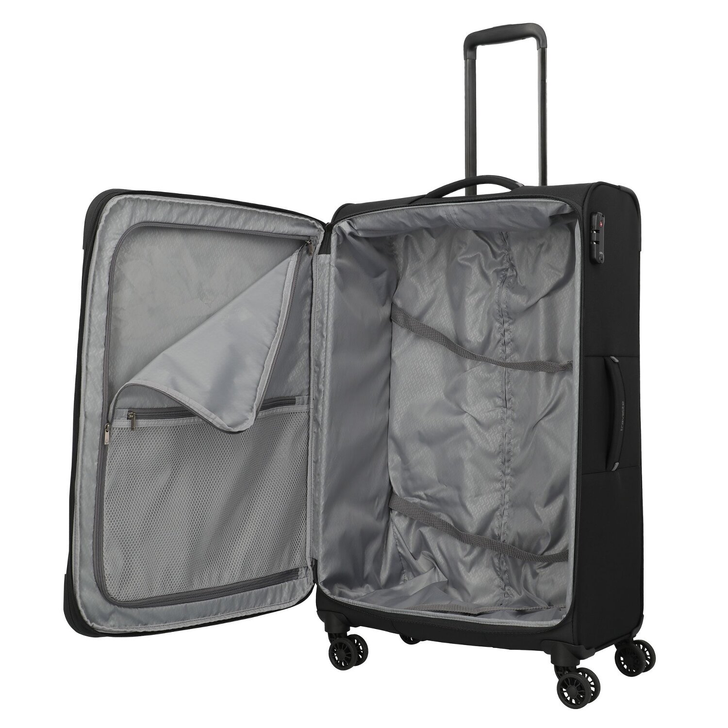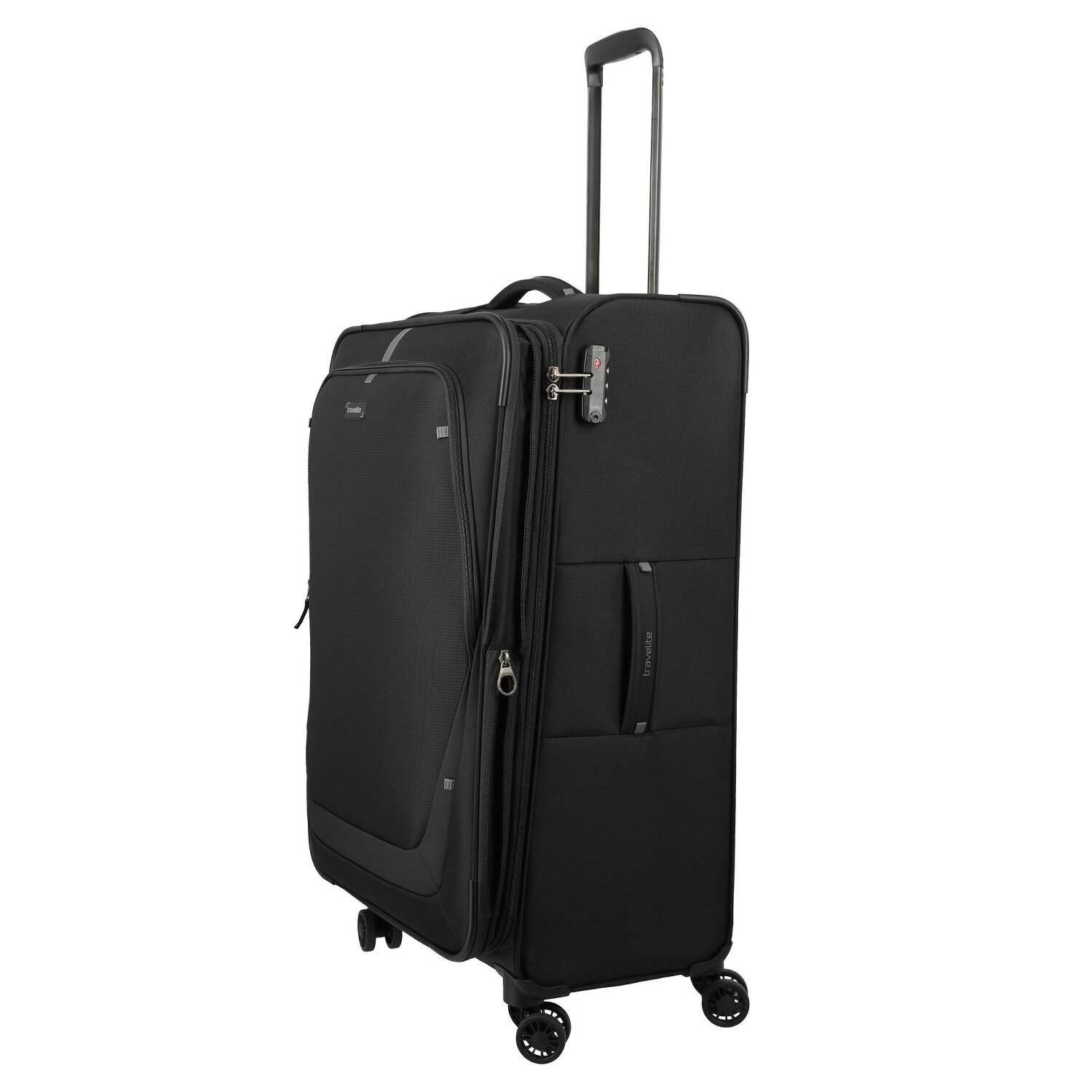 - Ausstattung: Tasche(n) außen, Reißverschlussfach, Netzfach, Dehnfalte, arretierbarer Griff