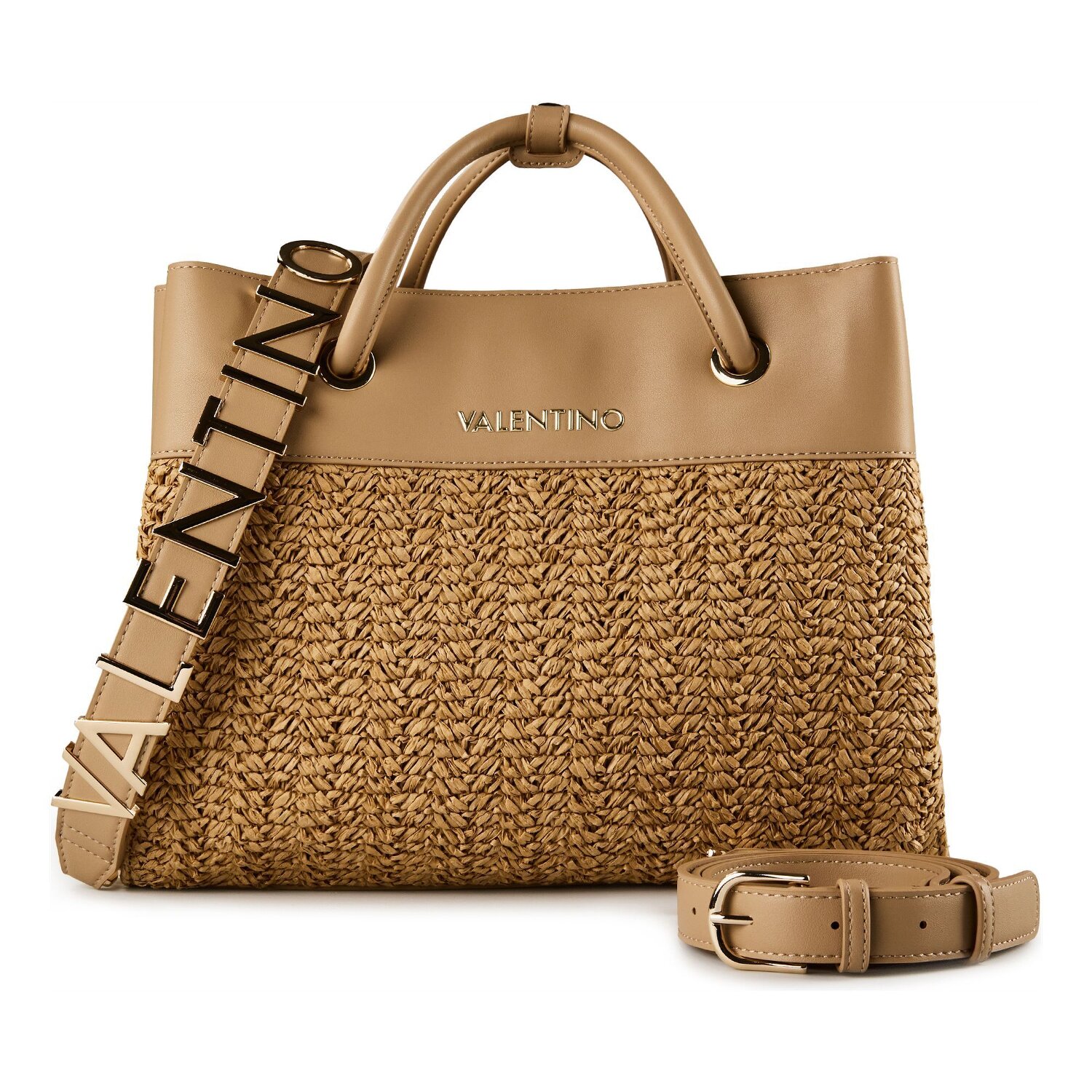 Beginnen Sie Ihren Tag mit einer Welle von Stil und Funktion mit der Valentino Alexia Summer Shoppertasche. Mit ihrem durchdachten Design und Ausstrahlung von Raffinesse ist sie ein echter Blickfang. Angefertigt aus hochwertigem Bast Material, bietet diese Tasche eine attraktive Kombination aus Natürlichkeit und Robustheit. Sie verfügt über einen praktischen Magnet- und Reißverschluss, der schnellen und unkomplizierten Zugang zu Ihren täglichen Essentials gewährleistet. Das Highlight ist der verstellbare und abnehmbare Umhängeriemen, der zusammen mit dem kurzen Henkel, vielfältige Tragemöglichkeiten bietet. Ergänzen Sie Ihre Garderobe mit dieser unverzichtbaren Accessoire von Valentino und heben Sie Ihre Mode auf die nächste Ebene.