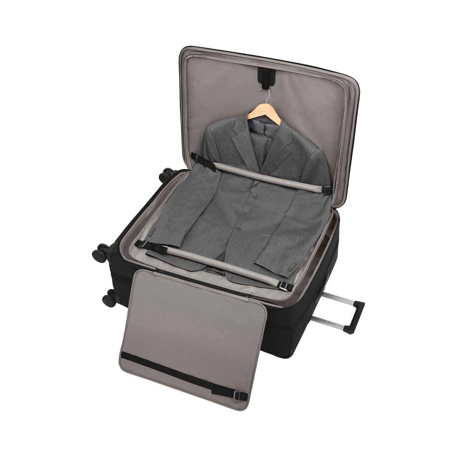 - Ausstattung: Wäschefach, Reißverschlussfach, Kreuzpackgurt, Dehnfalte, arretierbarer Griff