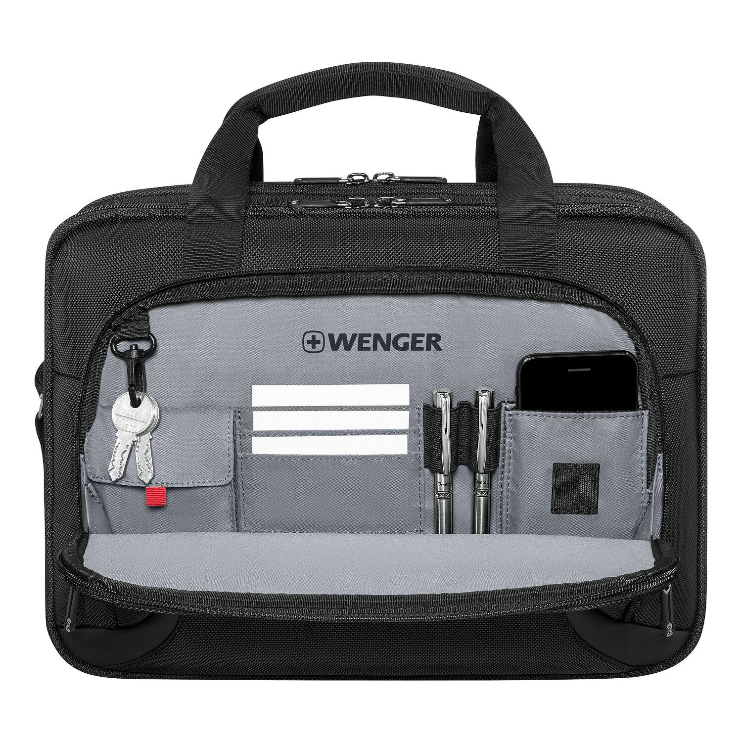 Entdecken Sie die wunderbare Verbindung von Praktikabilität und zeitgemäßem Design mit der Aktentasche der Marke Wenger aus der Serie Prospectus. Konzipiert für den modernen Geschäftsmann oder die Geschäftsfrau, verhilft sie zu einer nahtlosen Organisation dank nützlicher Features wie einem Handyfach, diversen Taschen innen und außen sowie speziellen Fächern für Tablet und Laptop mit einer Bildschirmdiagonale von bis zu 39 cm. Ein praktischer Verschluss ermöglicht schnellen Zugriff auf Ihre Arbeitsmaterialien. Spezifische Details wie der Schlüsselhalter und Stiftelaschen erhöhen die Nutzbarkeit und der robuste Polyesterstoff garantiert Langlebigkeit. Für Geschäftsleute, die Wert auf Funktionstüchtigkeit und schlichte Eleganz legen, ist dieses Produkt eine aussichtsreiche Wahl.