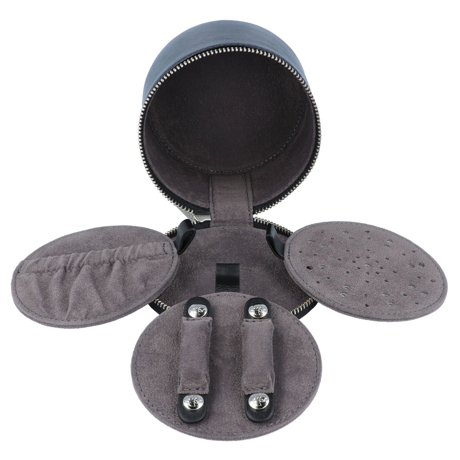 Edles kleines Schmucketui von Windrose aus weichem Vollrindnappa. Das Etui besitzt drei verschiedene, herausnehmbare Ebenen mit einem Steckfach, Spiegel oder sie können sie einfach nur als raumteilendes Element einsetzen.