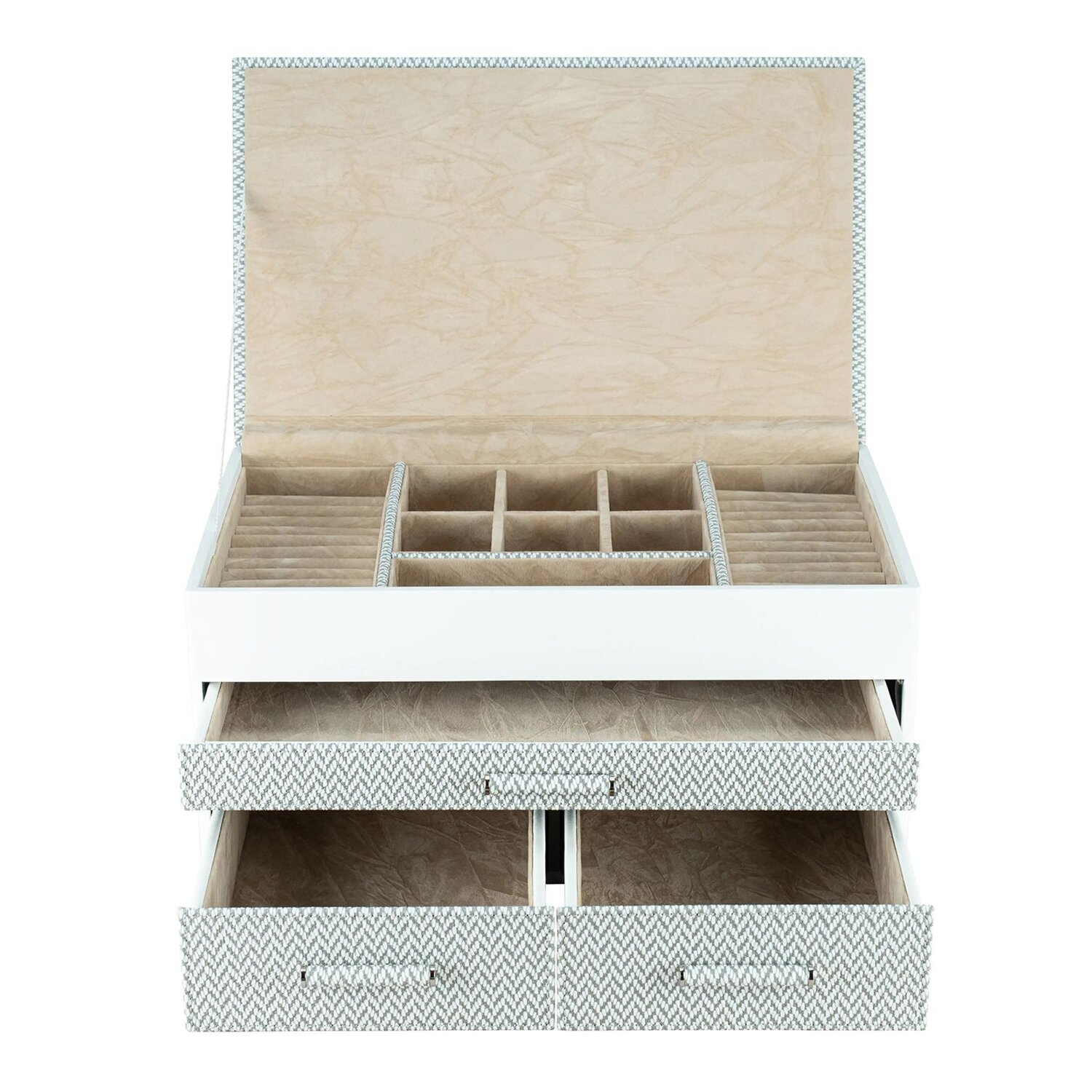 Der luxuriöse Schmuckkasten von Windrose begeistert mit Fächern für jede Art von Schmuck und drei praktischen, ausziehbaren Schubladen, die für perfekte Ordnung sorgen. Das stilvolle Windrose-Logo ziert die elegante Front, während der zuverlässige Magnetverschluss Ihre wertvollen Schmuckstücke sicher verwahrt. Ein Must-have für anspruchsvolle Schmuckliebhaberinnen.