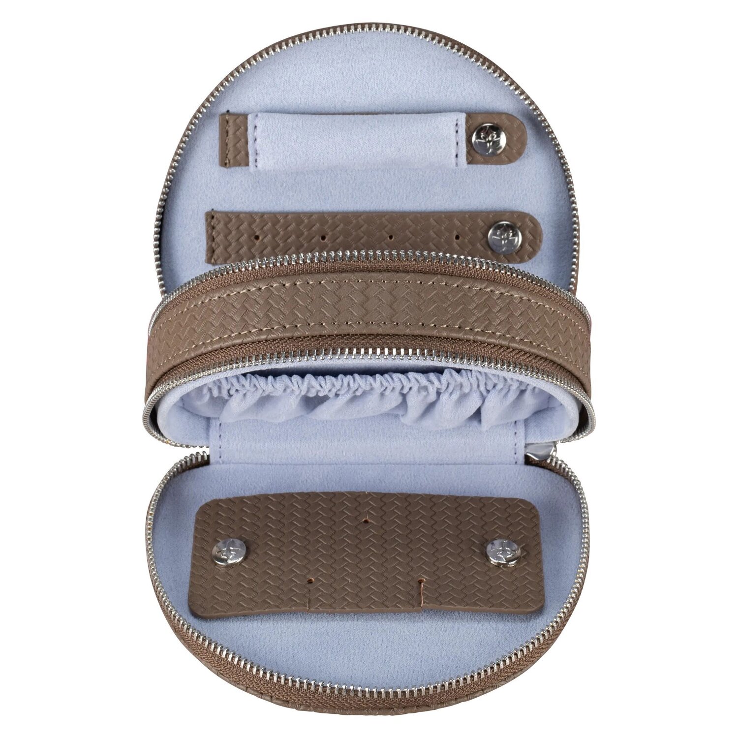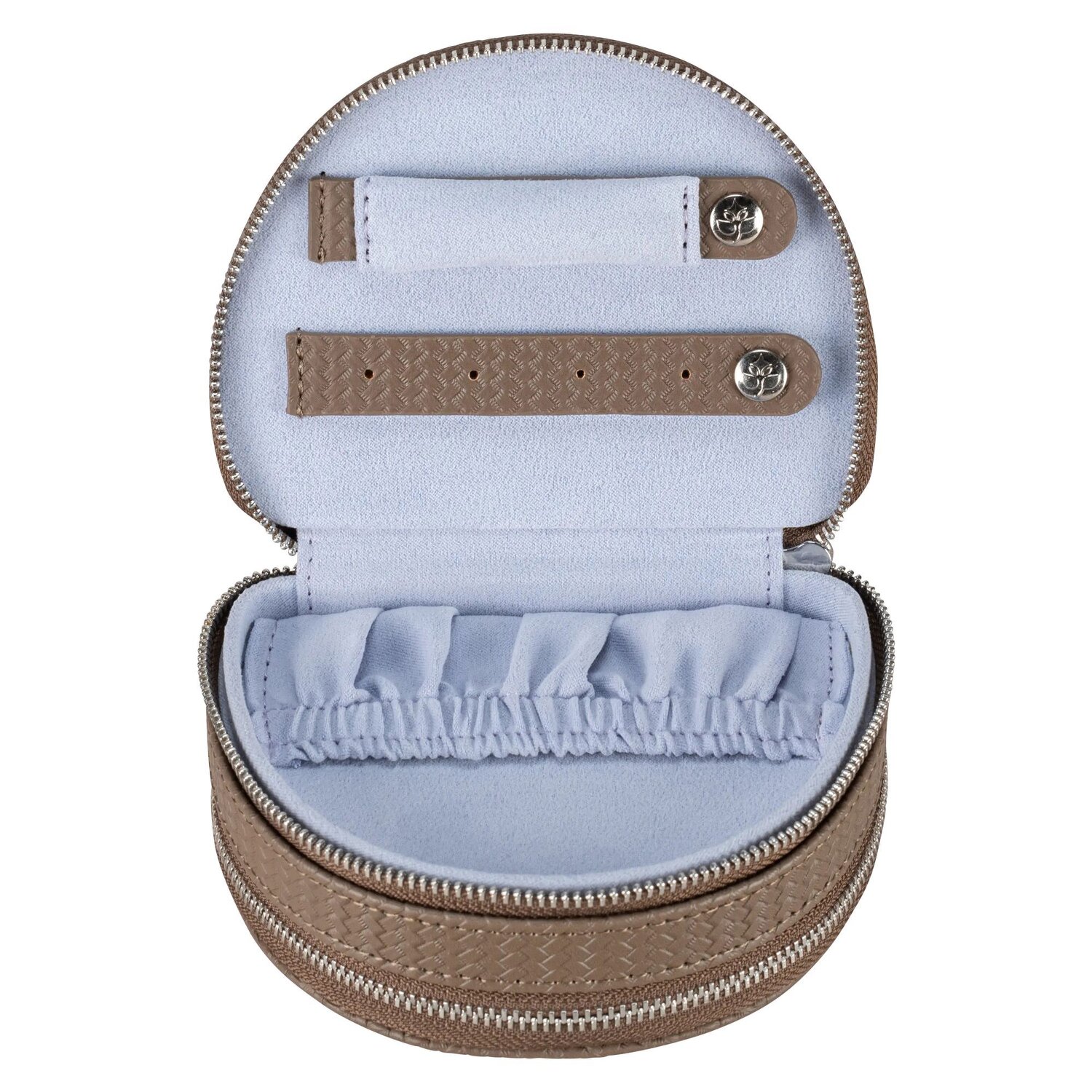 Dieser elegante Schmuckkasten von Windrose vereint stilvolles Design mit praktischer Funktionalität. Das Fach mit Gummizug bietet sicheren Halt für Ihre wertvollsten Schmuckstücke, während der Reißverschluss ein einfaches Verschließen ermöglicht. Der Windrose-Schriftzug auf der Front verleiht dem Schmuckkästchen eine edle Note – perfekt für stilbewusste Damen.