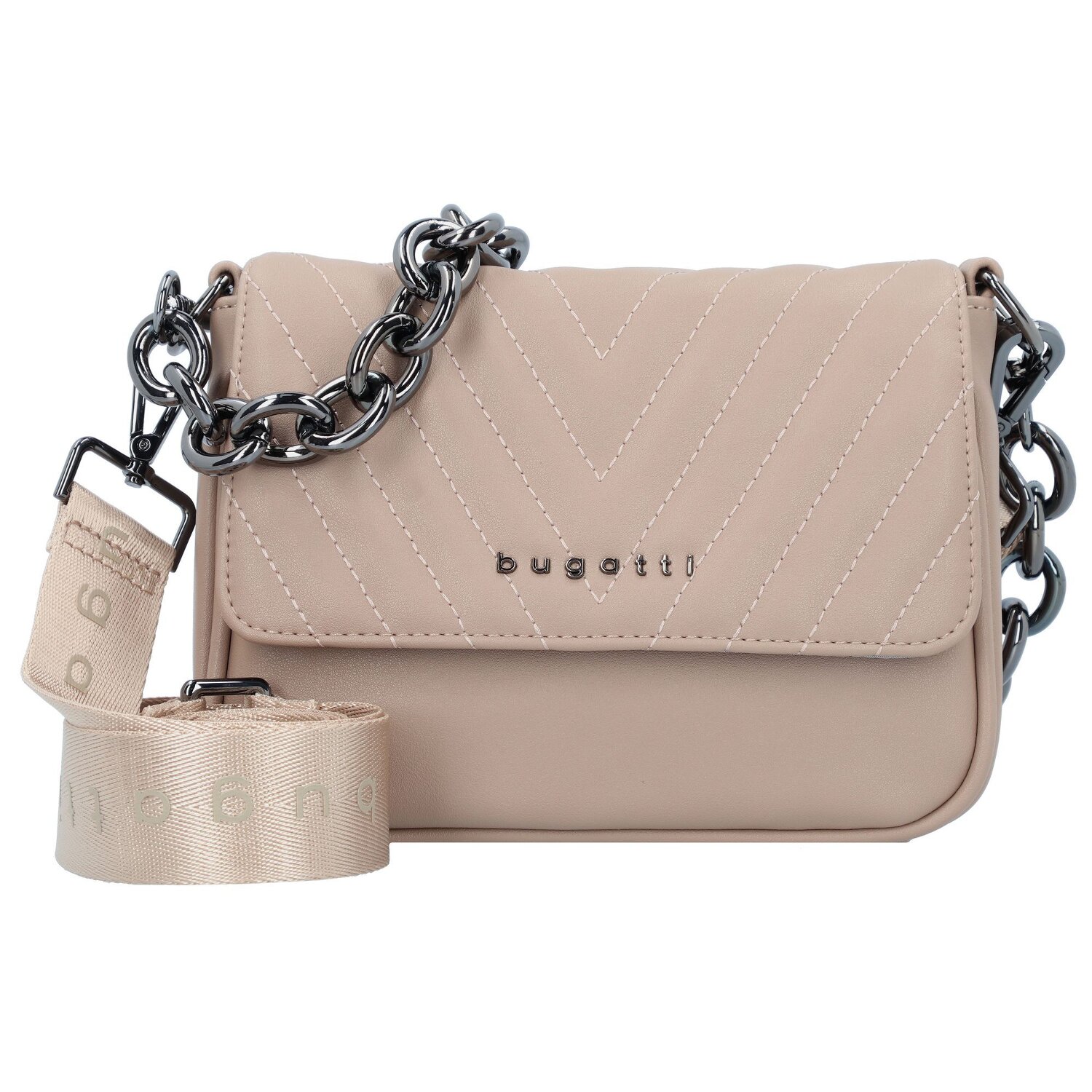 Elegante Umhängetasche der Marke Bugatti. Im Hauptfach ist ein zusätzliches Steckfach enthalten. Die Handtasche überzeugt nicht nur durch ihr stilvolles Design, sondern auch durch ihr zusätzliches kleines Mäppchen zum Verstauen von Münzen oder anderen Kleinigkeiten. Sowohl der Schulterriemen als auch der Umhängeriemen ist abnehmbar. Der Umhängeriemen ist auch längenverstellbar um die Tasche auf die Größe anzupassen.