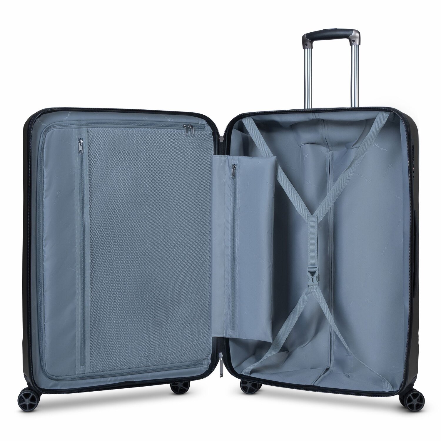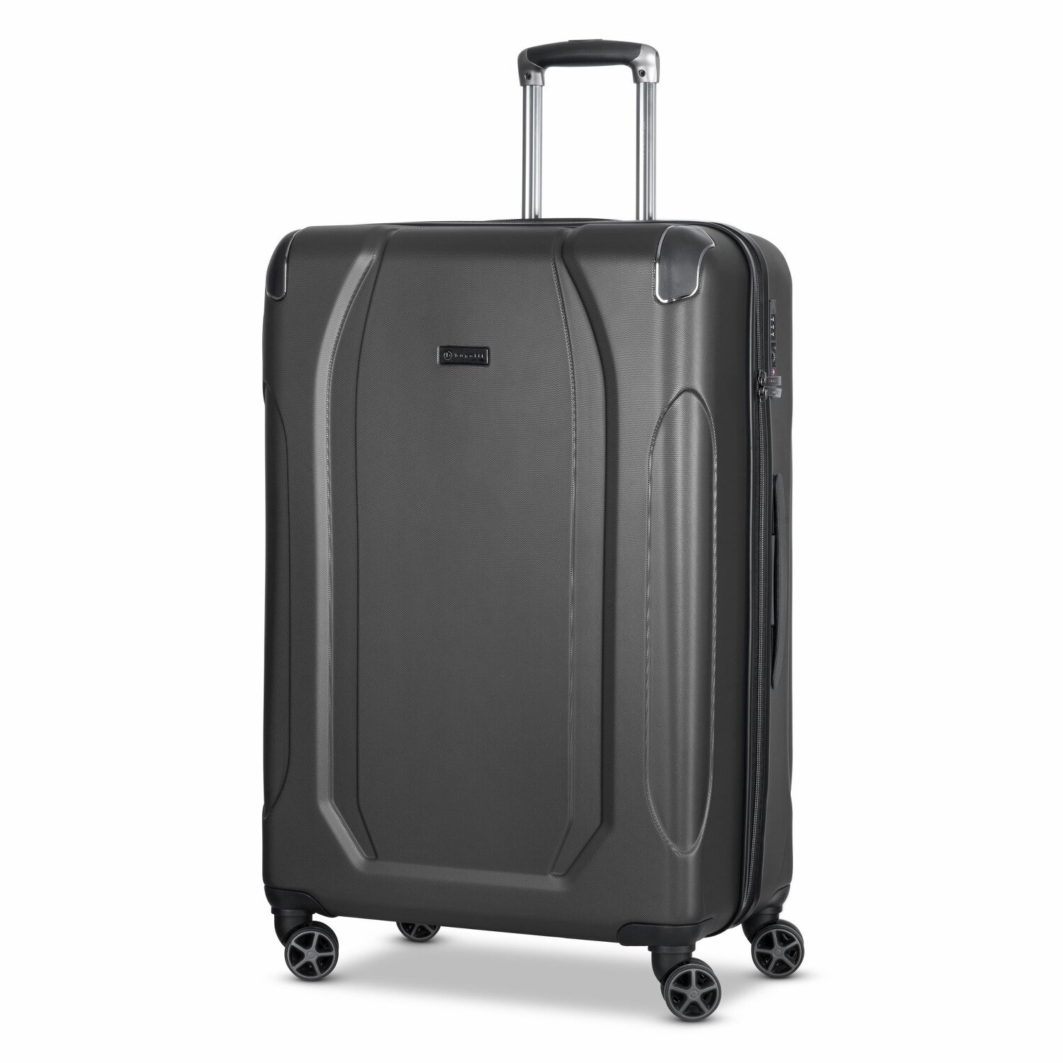 Eleganz trifft auf Funktionalität: Hochwertiger Trolley von Bugatti aus strapazierfähigem ABS in modernem, formschönem Design. Der Trolley mit vier stabilen Rollen, Teleskopgriff und TSA-Zahlenschloss bietet ein geräumiges Hauptfach mit Kreuzspanngurt und Reißverschlussfach sowie ein großes Netzfach.