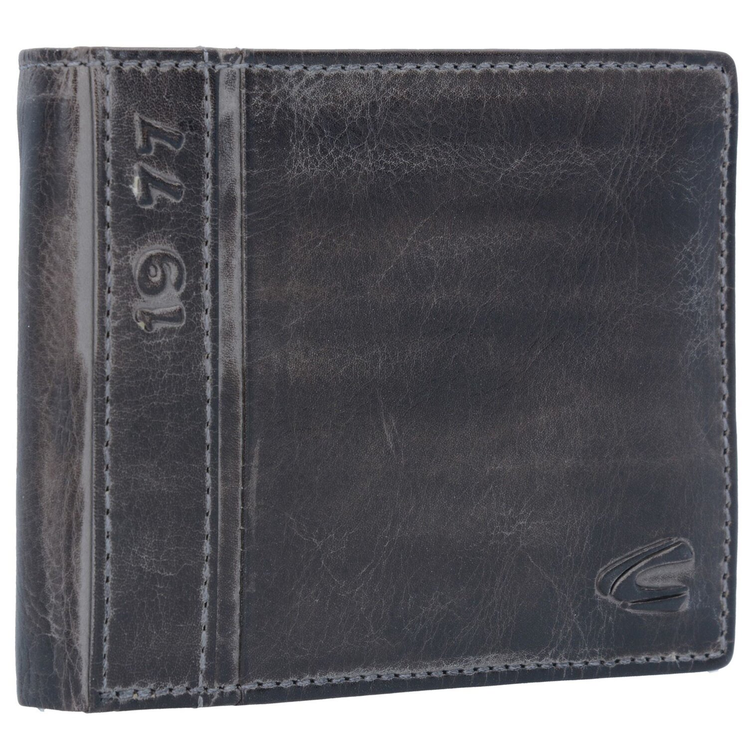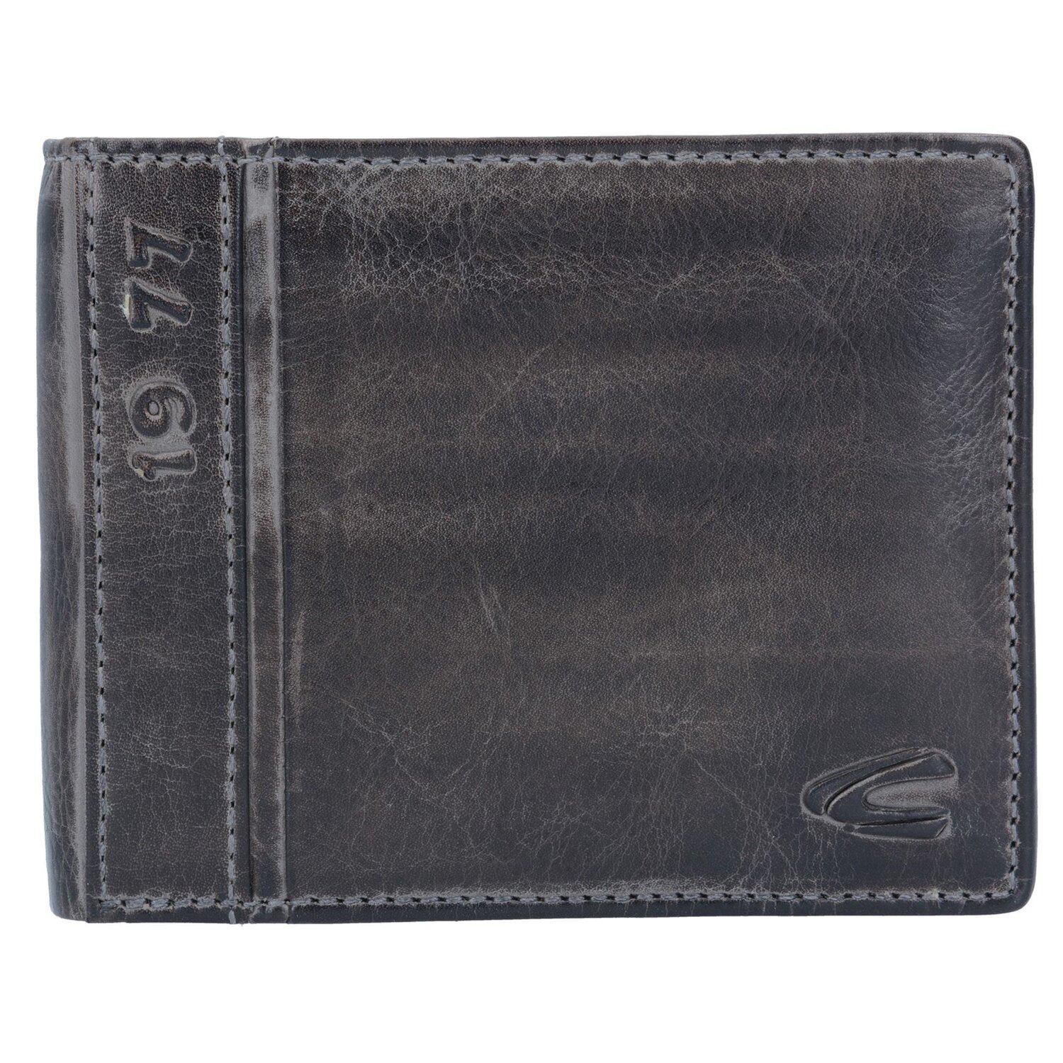 Die handgefertigte Geldbörse von camel active besteht aus Naturleder. Auf der Vorderseite erscheint das eingestanzte Herstellerlabel.