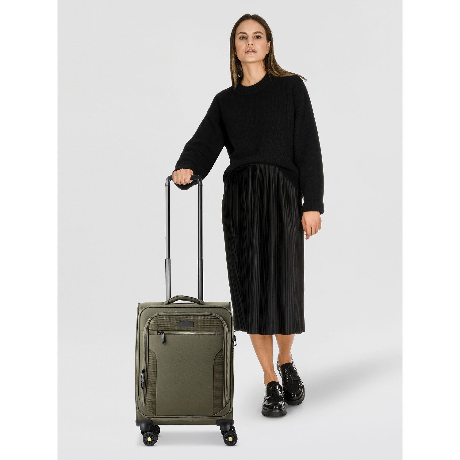 - Ausstattung: Wäschefach, Tasche(n) innen, Tasche(n) außen, Dehnfalte, arretierbarer Griff
